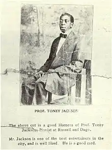 Tony showed musical talents at a young age. At about the age of 10 he reportedly constructed a type of crude but working and properly tuned harpsichord out of junk in his back yard, since his family lacked the money to buy or rent a piano.[6] On this contraption young Tony was able to reproduce hymns he heard in church; news of this accomplishment soon spread around the neighborhood and he was offered use of neighbors' pianos and reed organs to practice on. Jackson got his first musical job at age 13,[7] when he began playing piano during off hours at a Tonk run by bandleader Adam Olivier.