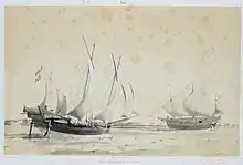However, different illustrations and descriptions showed variations of toop's hull: There are European-type hulls, with rectangular sterns and middle (axial) steering; there are boats with bow similar to European ships, but using side steering (double quarter rudder) and stern decks similar to padewakang. The difference of hull forms suggests that the word 'toop' actually refer to the sail plan, a combination of fore-and-aft 'Western' sails and two elevated rectangular sails that seems to be a variety of tanja sails.[6][7]