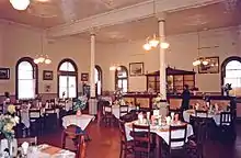 The Railway Refreshment Room is an impressive and generously proportioned space containing timber serveries at both ends, and round timber tables and timber chairs. The walls are decorated with large black and white photographs of local beauty spots, and the tables are set with monogrammed silverware and crockery. The interior is finely detailed with pressed metal ceilings with elaborate ceiling roses, cast iron columns with floriated capitals, and decorative pressed metal cornices and beam encasings. The adjacent Tea Room (1915 - now used as offices) also has a high pressed metal ceiling.[1]