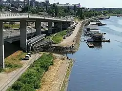Due to the road, bridge and interchange construction, the section of the river was moved 20 m (66 ft) to the east. As this is the location where the stream of Kaljavi Potok flows into the Topčiderka, its mouth was also moved while the final 100 m (330 ft) of its flow were conducted underground, through the pipes. The new bridge is 19 m (62 ft) long and 26 m (85 ft) wide, with three lanes in each direction.[14] The works on the relocation of the river began on 1 March 2018,[15] and were finished by August 2019.[16] The bridge became operational on 22 March 2019.[17] Further widening of the boulevard along the river began in the late summer of 2019, and was set to finish in the spring of 2021, but the deadline was moved to September 2021, then to May 2022,[18] and to October 2022,[19] before the deadline was moved for the summer of 2024.[20]