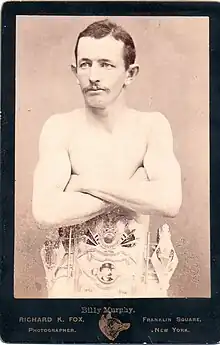 In an important bout on 30 July 1889, he fought a twenty-seven round draw against English champion Frank Murphy in what was billed as a World 120 pound title match. The bout was fought at the California Athletic Club in San Francisco for a purse of $1,800 dollars.[2][3] In a close fight, Frank Murphy was down twice in the fifteenth, but had the better of the seventeenth through nineteenth rounds. Frank Murphy was down again in the twenty-second round. The fight was stopped by Referee Cook with the help of the police in the twenty-seventh because neither men appeared to be able to continue the match. Upon examination in their dressing rooms after the match, Billy Murphy was found to have a fracture of the radius of his left arm, and Frank Murphy's wrist was swollen and bruised. Torpedo Billy paused in his boxing schedule for five months to recover.[4] From the twentieth through the final twenty-seventh round, both men appeared fatigued and did far less fighting than the first twenty rounds.[5]