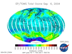 Near-global ozone for September 6, 2004, by TOMS-EP
