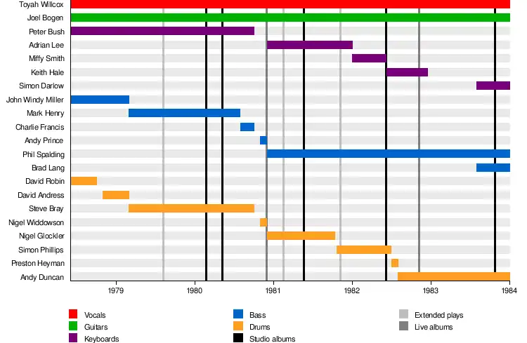 | Past members | Toyah Willcox Joel Bogen David Robin John Phillips Carrie Kotzberg Nigel Glockler Adrian Lee Keith Hale Simon Phillips Simon Darlow Andy Clark Preston Heyman Andy Duncan Brad Lang Peter Stroud Nigel Elliot Miriam Stockley Lynn Garner |
