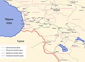 The railway started in 1865 at the port town of Poti on the Black Sea. The railway reached Zestafoni in 1871 and T'bilisi in 1872. The contractor for this part of the line was Messrs G.B. Crawley and Co.; the resident engineer was Edward Preston, C.E. who had previously been at work in North Wales.[2] This may account for the interest shown by this railway in Welsh mountain railways and narrow-gauge steam locomotives running on the north Wales Festiniog Railway.[3] A branch line was built to Kutaisi, branching from Brotseula, in 1877. In 1883 the railway was completed to Baku. Once the railway was completed to Baku, freight trains carrying oil went from Baku to Poti to be shipped to other cities in Russia via the Black Sea. During the Russian-Ottoman war from 1877–1878, the Russian Empire gained territory into Anatolia from the Ottoman Empire after defeating them during the Battle of Kars. This new territory included the fortress city of Kars. In 1887 a branch line was built to Tkibuli. In 1894 a branch line, splitting of at Khashuri, was built to Borjomi. Kars was a strategic city for the Russians in Anatolia, so in 1899 the railway built a branch line from T'blisi to Kars. The Transcaucasus Railway was connected to the rest of the Russian system in 1900, when the line from Baku to Makhachkala was completed. In 1902, the narrow gauge Borjomi to Bakuriani Railway was built to serve the skiing community in the region. In 1913 the railway was extended from Kars to Sarıkamış; the border of the Russian Empire and the Ottoman Empire at the time. When World War I broke out in 1914, the Russian Empire sided with the Allied powers while the Ottoman Empire sided with the Central Powers making the two empires enemies. After the Erzerum Offensive, Russia gained control city of Erzurum. To support campaigns further into Ottoman territory, a 750 mm (2 ft 5+12 in) gauge railway was built from Sarıkamış to Erzurum in 1916 and extended to Yeniköy later the same year. Russia had to stop fighting in the war because of the Russian revolution of 1917, that led to the dissolution of the Russian Empire.