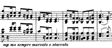 The piece starts with a furious quick main theme, left hand playing the melody in octaves and the right hand playing the same melody one octave higher alternatively, quickly followed with chords. The furious main theme flows into the playful melody of the secondary subject. When actually played at the original speed that Liszt indicated ("Presto furioso", or fast and furious; at around 4+1⁄2 minutes), the piece quickly becomes formidable. Wide jumps in the beginning span about three octaves in the right hand. The lyrical middle section involves some difficult left-hand jumps rapidly spanning over two octaves. The ending involves a difficult section of octave jumps in the right hand spanning three octaves. The piece ends in a flurry of descending chords.