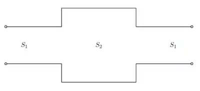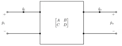 The low-frequency approximation implies that each subsystem is an acoustic two-port (or four-pole system) with two (and only two) unknown parameters, the complex amplitudes of two interfering waves travelling in opposite directions. Such a system can be described by its transmission matrix (or four-pole matrix), as follows[3]