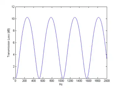 where is the ratio of the cross-sectional areas and is the length of the chamber. is the wave number while is the sound speed. Note that the transmission loss is zero when is a multiple of half a wavelength.