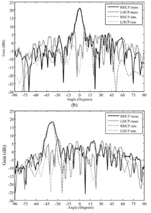 First, consider fixed transmitarrays. At each location on the surface of the structure, the unit cells are physically scaled or rotated in order to obtain the required amplitude and phase distribution. Thus, only one focusing direction is available. The aim is to approximate the ideal phase distribution, such as for a feed located at , which can be achieved by discretising the surface of the transmitarray into several Fresnel zones. High aperture efficiency (55%) can be achieved at oblique angles of incidence using precision-machined double split ring slot unit cells.[7] A switched-beam transmitarray covering the 57 – 66 GHz band has been reported.[8] Three different types of unit cells were used, based on patches and coupling slots. Similarly, a 60 GHz design used unit cells with a 2-bit phase resolution and selected an optimal ratio to widen the bandwidth.[9] When = 0.5, a scan loss of 2.2 dB was achieved at a 30° steering angle.