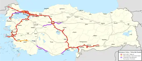 There are daily regular passenger trains all through the network.[7] TCDD has started an investment program of building 5.000 km high-speed lines until 2023. As of October 2019, three high speed train routes are running: Ankara-Eskişehir-İstanbul, Ankara-Konya and İstanbul-Eskişehir-Konya.