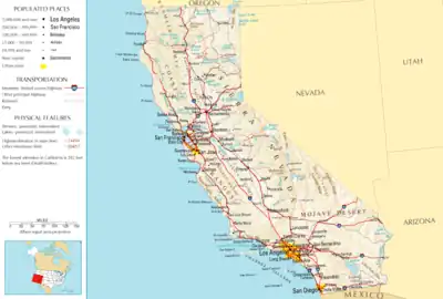 Perhaps it is a testament to California's sheer size that although it has one of the most extensive freeway systems in the United States, it contains many of the largest cities in the United States not served by an Interstate Highway, including the two largest, Fresno (pop. 471,479) and Bakersfield (pop. 247,057).[2] These cities, along with Modesto and Visalia, are passed by as I-5 veers west to avoid the congestion of the populated eastern side of the Central Valley as it connects Sacramento and Los Angeles.[3]