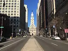 The system for assigning street addresses was enacted in 1858.[2] In areas with a consistent grid, the street address numbers increase by intervals of 100s for each block,[2] starting with Front Street for east–west streets and Market Street for north–south streets. For example, 1200 South Street would refer to the intersection of 12th & South Street, and 500 North 17th Street is 5 blocks north of Market Street.