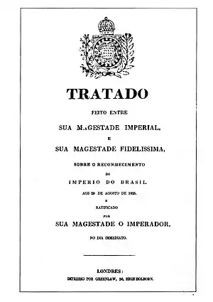 The Treaty of Rio de Janeiro is the treaty between the Kingdom of Portugal and the Empire of Brazil, signed August 29, 1825, which recognized Brazil as an independent nation, formally ending the Brazilian war of independence.