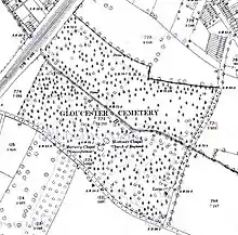 A burial board was formed for the city of Gloucester in 1856 and the Tredworth Road Cemetery opened in 1857 after which the dead of the city ceased to be interred in the old city churchyards formerly used for that purpose.[2] The cemetery was originally of 13 acres to the north of Tredworth Road but it was extended in 1875, 1909 and 1911 to include land to the south of the road by which time it covered 35 acres.[3] The two areas were known as the "old cemetery" and the "new cemetery". When Coney Hill Cemetery and Crematorium was opened in 1939, the whole of the Tredworth Road Cemetery became known colloquially as Gloucester Old Cemetery with the northern part known as "chapel side" and the southern side as the "B" ground.