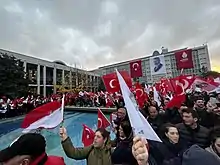 Several politicians condemned the verdict.[10] Thousands of people held a rally in front of the Istanbul Municipality in support of İmamoğlu.[10] The trial drew wide international condemnation[11] and European mayors gathered at Istanbul in a show of support.[12] The former President Abdullah Gül called the ruling an injustice to İmamoğlu but also to Turkey.[10] According to a survey on the sentence, the majority of the surveyed[4] also the voters for the ruling Justice and Development Party (AKP),[1] and also international observers see it as a politically motivated verdict in support the electoral campaign of the current Turkish President Recep Tayyip Erdoğan.[10][13]