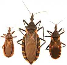 | (Left to right) Triatoma protracta, the most common species in the western U.S.; Triatoma gerstaeckeri, the most common species in Texas; Triatoma sanguisuga, the most common species in the eastern U.S. | |