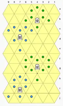 Trishogi has the same types and numbers of pieces as shogi, and all normal shogi rules apply, including initial setup (see diagram), drops, promotion, check, and checkmate. As in shogi, pieces capture the same as they move. But the triangular geometry creates special move patterns for the pieces.
