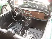 Apart from the increase in width and the IRS badge on the rear of the car, other changes included a revised grille and new bonnet badge. There was also a new line of chrome trim on the side, starting near the rear edge of the door and ending at the front of the car with integrated signal/marker lights, which were moved from their earlier position in the corners of the grille. New smaller front bumpers and a convertible top patterned after the one from the Herald completed the exterior differences. On the interior the fly-off handbrake lever was moved to the transmission tunnel between two revised seats, the gearshift lever was shortened and the white painted steel dashboard was now always covered by walnut, which had been optional in the TR4.