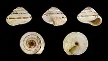 | Five views of a shell of Trochoidea pyramidata (Draparnaud, 1805) | |