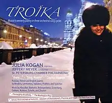 Troika: Russia's westerly poetry in three orchestral song cycles is a 2011 album of contemporary classical songs performed by soprano Julia Kogan, who also conceived the project.[1] She is accompanied by The St. Petersburg Chamber Philharmonic conducted by Jeffery Meyer. The songs are set to Russian, English, and French language poetry by five classic Russian writers: Joseph Brodsky, Mikhail Lermontov, Vladimir Nabokov, Aleksandr Pushkin and Fyodor Tyutchev. Eight modern composers, from France, Russia, and the United States, wrote music for the album: Isabelle Aboulker, Ivan Barbotin, Eskender Bekmambetov, Jay Greenberg, James DeMars, Andrey Rubtsov, Michael Schelle and Lev Zhurbin.