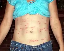 Trombiculosis is a rash caused by trombiculid mites, especially those of the genus Trombicula (chiggers). The rash is also often known as chigger bites. Chiggers are commonly found on the tip of blades of grasses to catch a host, so keeping grass short, and removing brush and wood debris where potential mite hosts may live, can limit their impact on an area. Sunlight that penetrates the grass will make the lawn drier and make it less favorable for chigger survival.