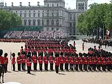 Trooping the Colour is a ceremonial event performed every year on Horse Guards Parade in London, United Kingdom, by regiments of Household Division, to celebrate the official birthday of the British sovereign.[1] It is also known as the Sovereign's Birthday Parade. Similar events are held in other countries of the Commonwealth. In the UK, it is, with the State Opening of Parliament, one of the biggest events of the ceremonial calendar, and watched by millions on TV and on the streets of London.