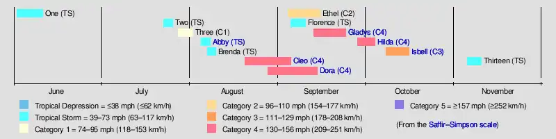 The first system, an unnamed tropical storm, developed on June 2.[3] It struck Florida as a tropical depression and then strengthened into a tropical storm while out at sea. The storm ceased to exist on June 11. Thereafter, the season went dormant for nearly seven weeks, as the next cyclone, another unnamed storm, did not form until July 23. This would be followed by the development of a third unnamed system on July 28. Tropical cyclogenesis increased in August, which had four tropical cyclones, Abby, Brenda, Cleo, and Dora. The strongest storm of the season, Cleo, peaked with maximum sustained winds of 150 mph (240 km/h) and a minimum barometric pressure of 938 mbar (27.7 inHg). Four additional storms originated in September, including Ethel, Florence, Gladys, and Hilda. Hurricane Isbell was the sole tropical cyclone to form in the month of October. The final system, another unnamed storm, existed developed on November 5 and dissipated on November 10.[3]