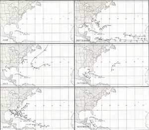 The season officially began on June 1,[2] and lasted until November 30, 1971; these dates conventionally delimit the period of each year when most tropical cyclones form in the Atlantic basin.[3] With thirteen tropical storms, of which six became hurricanes, the season was active. Despite the activity, damage in the United States totaled about $235 million (1971 USD, $1.7 billion 2023 USD), which National Hurricane Center forecaster Paul Hebert noted was "pretty small considering we had five storms in a row strike the U.S."[3] Most of the damage came from Tropical Storm Doria, which affected much of the East Coast of the United States. Hurricane Fern struck Texas after executing an unusual track, dropping heavy rainfall and producing flooding. The first storm, Arlene, developed on July 4 off the coast of North Carolina. Activity was steady through most of the season, and the last storm, Laura, dissipated on November 22.