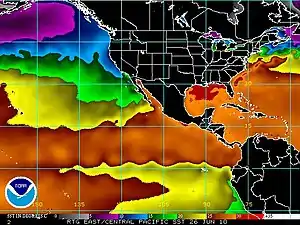 Tropical instability waves, often abbreviated TIW, are a phenomenon in which the interface between areas of warm and cold sea surface temperatures near the equator form a regular pattern of westward-propagating waves. These waves are often present in the Atlantic Ocean, extending westward from the African coast, but are more easily recognizable in the Pacific, extending westward from South America. They have an average period of about 30 days and wavelength of about 1100 kilometers, and are largest in amplitude between June and November. They are also largest during La Niña conditions, and may disappear when strong El Niño conditions are present.[1]