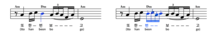 The 'Kkeokk-ki' technique may be better explained by the gruppetto ornament of classical music theory. A note is figured as if it had been split into two or four subsidiary notes. And the voice is inflected to these imaginary notes: e.g. one quarter note is split into four sixteenth notes: (1) one in original pitch - (2) one in upper pitch - (3) one in lower pitch - (1) one in original pitch again (see below image, the example measure is from Na Hun-a's "Turning Waterwell"). Kkeokk-ki happens in the transition between two notes in the original pitch. For ordinary listeners, it is not easy to quickly perceive the subtlety of this technique. However, any trot singer can hardly do without the elaborated effect of Kkeokk-ki.