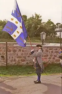 The troupes de la Marine were sent by Louis XIV in 1682 to replace the regular troops in New France, and were accordingly used to mount the garrisons in the various French colonies. Between 1683 and 1688, the King sent thirty-five companies to Canada. However, as the mortality and licensing of soldiers who were getting married and made themselves residents increased, numbers diminished considerably. Accordingly, Seignelay decided to reduce the number of companies to twenty eight on 24 May, 1689. This number would remain unchangeable until the beginning of the seven-year war. Versailles accordingly sent reinforcements by the fixing the number of companies at forty. At the end of the French regime, 2,600 soldiers of the troupes de la Marine were present in Canada. These effectifs were relatively important compared to the resident population since in 1688 for example, Canada housed 1,418 soldiers for a population of almost 10,300.[25] In a first phase, the officers present in Canada, all hailed from France. However, since 1685, the Canadian « gentilshommes » secured positions in the troupes de marine. The first two, La Durantaye and Bécancourt, embarked for Rochefort where they received a guard formation in la marine. Quite quickly, the officer corps of the troupes de la marine becomes Canadian « canadianise ». At the beginning of the 18th century, almost a third of the officers were born in Canada, then more than half of the officer corps in 1722. The officers were practically all recruited locally.[26]
