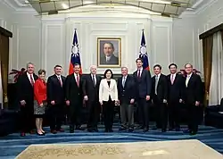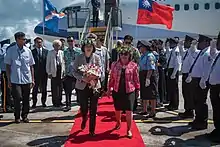 During summer of 2015, Tsai embarked on a visit to the United States and met a number of US policy makers including Senators John McCain and Jack Reed.[65] In her speech addressing Taiwanese diaspora on the east coast of the United States, Tsai signaled a willingness to cooperate with the rising Third Party coalition in Taiwan in the incoming general election.[66] On 14 November, Tsai's campaign announced that she had chosen Chen Chien-jen as DPP vice presidential candidate.[67] On 16 January 2016, Tsai won the presidential election, beating her opponent Eric Chu by a margin of 25.04%.[52] Tsai was inaugurated as president on 20 May 2016.[68]