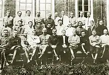 Following the Russian Revolution in 1917, the ruling communist Bolsheviks, in the fashion of most traditional Marxists, hoped to disband the standing Imperial Russian Army of the deposed Tsardom and replace it with a militia system. The outbreak of civil war led them to opt for a regular military in 1918 and they created the Red Army to oppose the anti-revolutionary White movement.[1] The pre-existing army had a 250,000-strong officer corps. Of these, 75,000 were inducted into the Red Army, most of them being drafted and many not supportive of the Bolsheviks' political agenda. However, a large number joined out of a desire to maintain Russian territorial integrity (they believed that only the Bolsheviks could govern effectively) and to curb foreign influence in the country (the White leadership had promised foreign governments special privileges under their rule in exchange for support).[2] As such, the overwhelming majority of the officers in the Red Army had formerly served in the Imperial military, much to the chagrin of Bolshevik leaders who were anxious to assert their authority over the armed forces. They were forced to rely on the ex-Tsarist officers, dubbed "military specialists", due to a deficit of trained commanders among the revolutionaries. Throughout the war the Red Army's command staff, the Stavka, was dominated by Tsarist officers.[1] In spite of his colleagues' wariness, Vladimir Lenin praised them for their contributions to the Bolshevik war effort:[2]