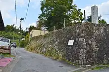 The Tsubai Ōtsukayama Kofun is a zenpō-kōen-fun (前方後円墳), which is shaped like a keyhole, having one square end and one circular end, when viewed from above. It is located at the end of a 60-meter hill approximately two kilometers north of where the Kizu River enters the plains of southern Yamashiro and turns north. In 1894, when the Nara Railway (now JR West Nara Line) track was being laid, the front of the posterior circular section of the tumulus was truncated, and in 1953, when the track was being widened during maintenance work, part of the tomb collapsed due to heavy rain, and a stone burial chamber was uncovered. This left the posterior portion with a semicircular shape, now covered in a bamboo forest. The anterior rectangular portion of the tumulus was also partially leveled, and private residences were constructed on the site. There is a cut approximately 15 meters wide to separate the hill from the east, and it appears to be the remnants of a surrounding moat. The total length of the tumulus is estimated to have been around 180 meters, and the posterior circular portion originally had a diameter of over 70 meters.[3]
