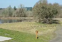 Wapato Lake Unit is located about 15 miles (24 km) to the west of the main refuge, near the city of Gaston along Oregon Route 47 in Washington and Yamhill counties.[16][37] The area was once the site of Wapato Lake, whose soil held an organic-rich peat that sustained a shrub swamp ecosystem. The wapato plant (Sagittaria fasciculata) grew in the upper marsh of the Wapato Lake Basin and was harvested by Native Americans.[33][38] In 1892, attempts began to drain the 800 acres (320 ha) lake to increase farmland,[16][39] with the Wapato Improvement District completing the effort in the 1930s.[40] Valley forests, prairies, and wetlands encompass the region today,[33] including two small streams, Ayers and Wapato creeks.[41]