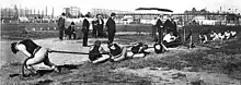Tug of war was contested as a team event in the Summer Olympics at the Games of every Olympiad from 1900 to 1920. Originally the competition was entered by groups called clubs. A country could enter more than one club in the competition, making it possible for one country to earn multiple medals. This happened in 1904, when the United States won all three medals, and in 1908 when the podium was occupied by three British teams.[1] Sweden was also among the top countries with two medals, one as a member of the mixed team.