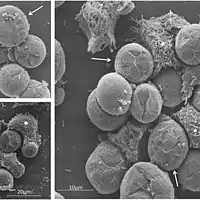 Viral particles are released, facilitated by cell lysis.[13] When infecting the amoeba in the species Vermamoeba vermiformis many assembled particles are not functional at the time of release. As many as half of released particles are not infectious; this phenomenon is also present when infecting host amoeba Acanthamoeba castellanii.[13] Although more research is required it is hypothesized that the production of non-infectious particles may be a normal part of the replication cycle.[13]