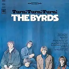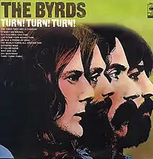 Turn! Turn! Turn! is the second studio album by American rock band the Byrds, released on December 6, 1965, by Columbia Records.[1] Like its predecessor, Mr. Tambourine Man, the album epitomized the folk rock genre and continued the band's successful mix of vocal harmony and jangly twelve-string Rickenbacker guitar.[2] The album's lead single and title track, "Turn! Turn! Turn!", which was adapted by Pete Seeger from text in the Book of Ecclesiastes, had previously been arranged in a chamber-folk style by the Byrd's lead guitarist Jim McGuinn for folk singer Judy Collins' third album,[3] but the arrangement he used for the Byrds' recording of the song utilizes the same folk-rock style as the band's previous hit singles.[4]