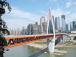 The Qiansimen Bridge (sometimes Qianximen Bridge) crosses the Jialing River with a cable-stayed main span that is 312 metres (1,024 feet), connecting the Jiangbei and the Yuzhong Districts. The placement of the single tower means that the cable-stayed back span of 240 metres (787 feet) provides a secondary channel for shipping. The bridge has a total length of 720 metres (2,362 feet) as it includes girder spans of 88 metres (289 feet) and 80 metres (262 feet). The bridge has nine pairs of cables. The Qiansimen Bridge has the longest stay cable of both bridges, measuring 256.85 metres (843 feet) long.[1] The bridge was shortlisted for an award by the Institution of Structural Engineers.[4]