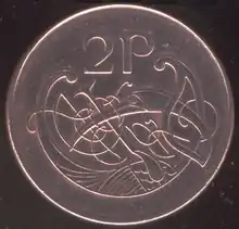 The two pence (2p) (Irish: dhá phingin) coin was the third smallest denomination of the Irish pound, being worth 1⁄50 of a pound. It was first issued on Decimal Day, 15 February 1971. The coin was minted until 2000. It was the third of three new designs introduced all in bronze, the others being the halfpenny and penny. All featured ornamental birds on the reverse.