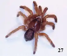 Typhochlaena paschoali is characterized mainly by its short, wide, straight, and multi-lobular spermathecae. It also has a brown cephalothorax and black abdomen with the dorsum (dorsal part of the abdomen) white with a zig-zag border. It is only known from the female.[2]