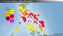 The Metropolitan Manila Development Authority(MMDA) placed a yellow alert on Metro Manila as Typhoon Nona approached Mindoro.[37] Storm signal no. 1 was raised on Metro Manila when the typhoon neared Northern Samar.[38][39] On December 16, preschool classes were suspended on the whole region, while classes on all levels were suspended on Muntinlupa, Pateros, Taguig, San Juan, Pasay, Quezon City, Malabon, and Valenzuela.[40]