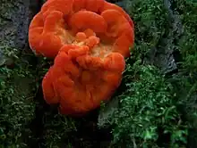 The fruit bodies of Tyromyces pulcherrimus are bracket-shaped caps that measure 3–8 cm (1.2–3.1 in) in diameter. They are sessile, lacking a stipe, and are instead attached directly to the substrate. The cap colour when fresh is cherry red or salmon, but it dries to become brownish. The cap surface can be hairy, particularly near the point of attachment. Pores on the cap underside are red, and number about 1–3 per millimetre. The flesh is soft and thick, red, and watery. It does not have any distinct odour.[6] Tyromyces pulcherrimus is inedible.[5]