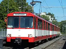 The U2 Class were the first production vehicles for the network. Duewag built 97 vehicles of this type in three batches from 1968 to 1978. A fire at the depot in 1980 destroyed five sets and were replaced with seven replica sets in 1984. They were painted in a red and white livery and used from 1968 to 2016. A variant, the U2h, features a lower boarding height than the regular U2, and was in use until 2013.