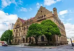 It is a three-and-a-half-story building, originally designed in the Romanesque Revival style by John T. Harris. It was expanded to three times its original size from 1907 to 1912, in a thorough process that unified old and new portions in the High Victorian Gothic style; the architect of record was James Knox Taylor.[2] The building utilizes tan rock-faced Berea sandstone, with trim of smooth sandstone. The building has round-arched windows topped with heavy hoodmolds, and projecting stone bands between its floors. The 1900s addition was built to the south of the original structure, using the same type of stone. New elements added include pointed arches, buttresses, and Gothic ornamentation. The building has a red tile roof, replacing an original slate roof.[3]