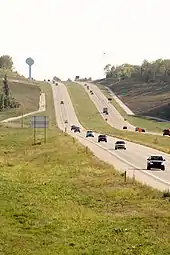 U.S. 59 enters the state just south of Chetopa and runs nearly directly north across the state. It runs concurrently with U.S. 169 starting about 5 mi (8.0 km) south of Garnett and diverges north again immediately south of Garnett. The intersection immediately south of Garnett used to be a "braided" intersection with stop and yield signs. It was identified as a high-crash location in 2001, and was rebuilt as a roundabout that opened in April 2006.[4] The Kansas Department of Transportation is rebuilding or planning to rebuild several other rural intersections as roundabouts for increased safety.[5][6] Until 2012, US 59 passed through Ottawa, Kansas, and had to be shut down or detoured every time the Marias Des Cygnes floodwall gates were closed across the highway. The highway now bypasses around Ottawa, running concurrently with Interstate 35 for 5 mi and using that highway's bridges over the Marias Des Cygnes. US 59 passes through Lawrence. The street name of US 59 in Lawrence is Iowa Street, then 6th Street as it joins U.S. 40 and jogs east to cross the Kansas River near downtown. North of the U.S. 40 and 59 Bridges, it splits with U.S. 40 as it joins U.S. 24 briefly and jogs back west before resuming a northerly course. It continues north to Nortonville, then northeast to Atchison, where it crosses the Missouri River over the Amelia Earhart Bridge.