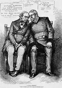 The gold standard and the tariff tax on imports divided the major parties.[5] The monetary debate was over the basis for the value of the United States dollar. Nothing but gold and silver coin had ever been legal tender in the United States until the Civil War, when the mounting costs of the war forced the United States Congress to issue "greenbacks" (dollar bills backed by government bonds).[6] Greenbacks helped pay for the war, but resulted in severe inflation .[6] After the war, bondholders and other creditors (based in the North) wanted to return to a gold standard. At the same time, debtors (especially in the South and West) benefited from the way inflation reduced the real value of their debts, and workers and some businessmen liked the way inflation made for easy credit.[7] The issue cut across parties, producing dissension among Republicans and Democrats alike and spawning a third party, the Greenback Party, in 1876, when both major parties nominated "hard money" candidates (i.e., candidates who favored the gold-backed currency instead of "soft money" greenbacks that generated inflation). Monetary debate intensified as Congress effectively demonetized silver in 1873 and began redeeming greenbacks in gold by 1879, while limiting their circulation.[8] As the 1880 election season began, the nation's money was backed by gold alone, but the issue was far from settled.[9]
