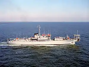 Albert J. Myer's primary mission at the time was maintenance of the Alaska Communications System which handled both military and commercial traffic to Alaska.[5] Two cables linking Port Angeles, Washington and Ketchikan, Alaska with forty-eight circuits were laid in 1956.[7] The ship also worked on projects for the Air Force and the Navy, including substantial assignment to Project Caesar in support of the Sound Surveillance System.[8] During 1957 the ship laid cable for the U.S. Air Force between Thule, Greenland and Baffin Island with a landing at Cape Dyer. The Cape Dyer landing, subject to damage by gounding icebergs, was bypassed by the ship in 1964.[9][10]