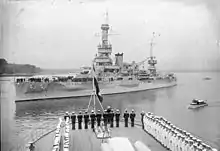 Arkansas participated in the Yorktown Sesquicentennial celebrations in October 1931, marking the 150th anniversary of the Siege of Yorktown. She embarked President Herbert Hoover and his entourage on 17 October, and took them to the exposition, and returned them to Annapolis on 19–20 October. She then went into drydock for an extensive refit in the Philadelphia Navy Yard, which lasted until January 1932.[2] During this time, she was under the command of George Landenberger.[13] Arkansas was transferred to the Pacific Fleet after completing the refit; while en route, she stopped in New Orleans to participate in the Mardi Gras celebration. She operated off the west coast through early 1934, at which point she was transferred back to the Atlantic Fleet, where she served as the flagship of the Training Squadron.[2]