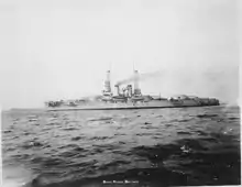 Arkansas was laid down on 25 January 1910, at New York Shipbuilding in Camden, New Jersey. She was launched on 14 January 1911, after which fitting-out work was effected. The ship was completed by September 1912, and was commissioned into the US Navy on 17 September, at the Philadelphia Navy Yard, under the command of Captain Roy C. Smith. Following her commissioning, Arkansas participated in a fleet review on 14 October 1912, for President William Howard Taft. The ship took Taft aboard that day for a trip to Panama to inspect the Panama Canal, which was still under construction. Arkansas began her shakedown cruise after delivering Taft and his entourage to the Canal Zone.[2] During this cruise, the Navy's first long-distance, continuous-wave, wireless telegraphy system was successfully tested, with regular transmissions received by Arkansas from a prototype Poulsen-arc transmission facility located in Arlington, Virginia.[4] On 26 December, she returned to the Canal Zone to take Taft to Key West, Florida. After completing the voyage, Arkansas was assigned to the Atlantic Fleet and participated in fleet maneuvers off the east coast of the United States. Arkansas's first overseas cruise, to the Mediterranean Sea, began in late October 1913. While there, she stopped in several ports, including Naples, Italy on 11 November, where the ship celebrated the birthday of King Victor Emmanuel III of Italy.[2]