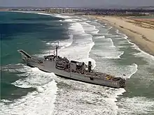 The Newport class were larger and faster than previous LSTs and were able to transport tanks, heavy vehicles and engineer groups and supplies that were too large for helicopters or smaller landing craft to carry.[6] The LSTs have a ramp forward of the superstructure that connects the lower tank deck with the main deck and a passage large enough to allow access to the parking area amidships. The vessels are also equipped with a stern gate to allow the unloading of amphibious vehicles directly into the water or to unload onto a utility landing craft (LCU) or pier. At either end of the tank deck there is a 30 ft (9.1 m) turntable that permits vehicles to turn around without having to reverse.[1][2] The Newport class has the capacity for 500 long tons (510 t) of vehicles, 19,000 sq ft (1,800 m2) of cargo area and could carry up to 431 troops.[1][7] The vessels also have davits for four vehicle and personnel landing craft (LCVPs) and could carry four pontoon causeway sections along the sides of the hull.[2][3]
